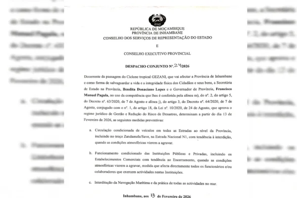 A Província de Inhambane vai implementar, a partir desta sexta-feira, 13 de Fevereiro de 2026, um conjunto de medidas preventivas devido à aproximação do Ciclone Tropical Gezani, fenómeno que poderá afectar significativamente a região nas próximas horas. A decisão consta do Despacho Conjunto nº 24/2026, assinado pela secretária de Estado na província, Bendita Donaciano Lopes,…